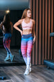 Leggings estampados degradé en tonos rosados, lilas y azules con líneas dinámicas que estilizan la silueta y acompañan cada movimiento.